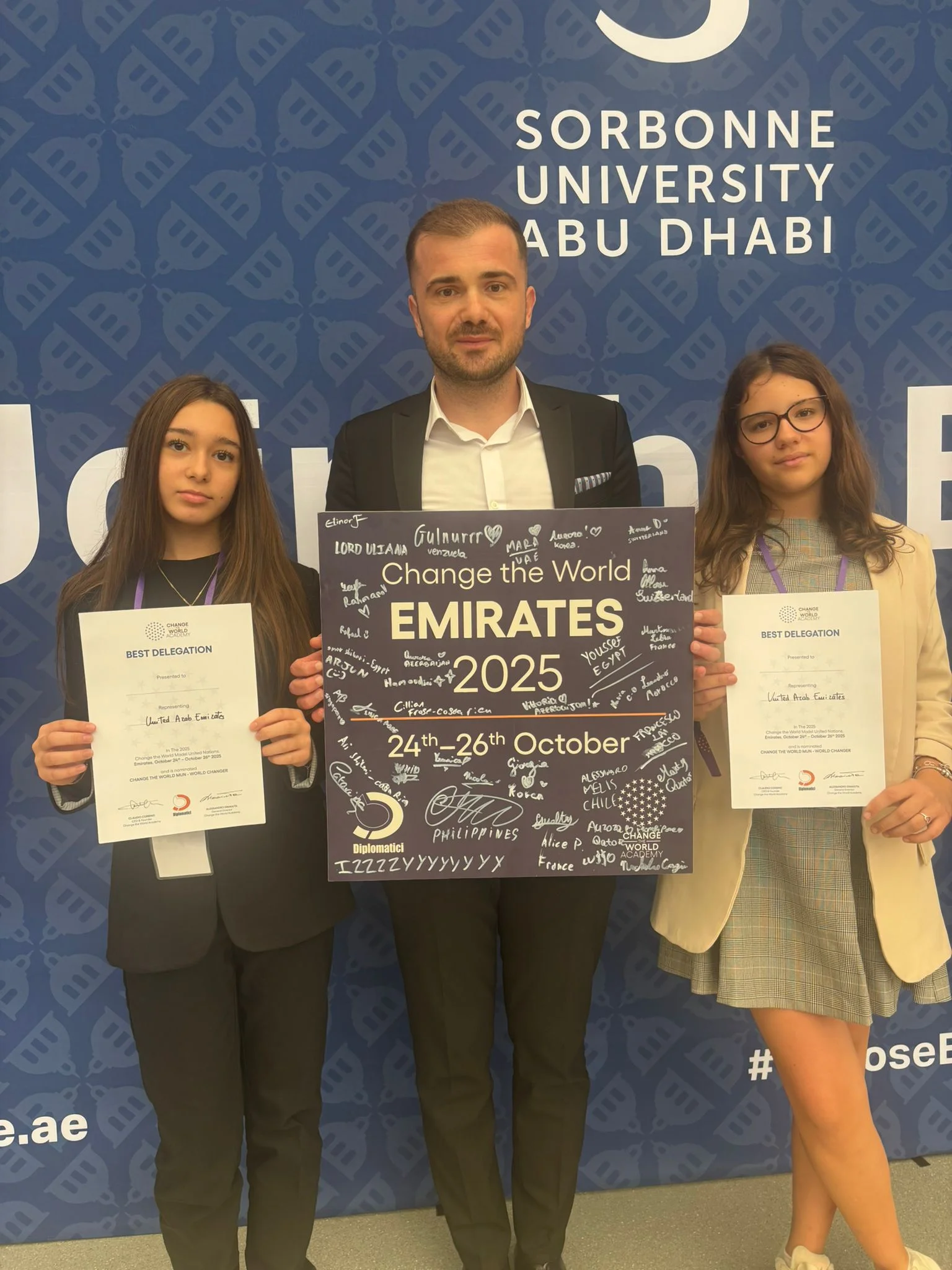 At the Change the World MUN Emirates conference held at Sorbonne University Abu Dhabi, our students Leyla Rahmanov and Mara Tingire achieved an impressive success among 1,200 participants, winning the “Best Delegation” award!
